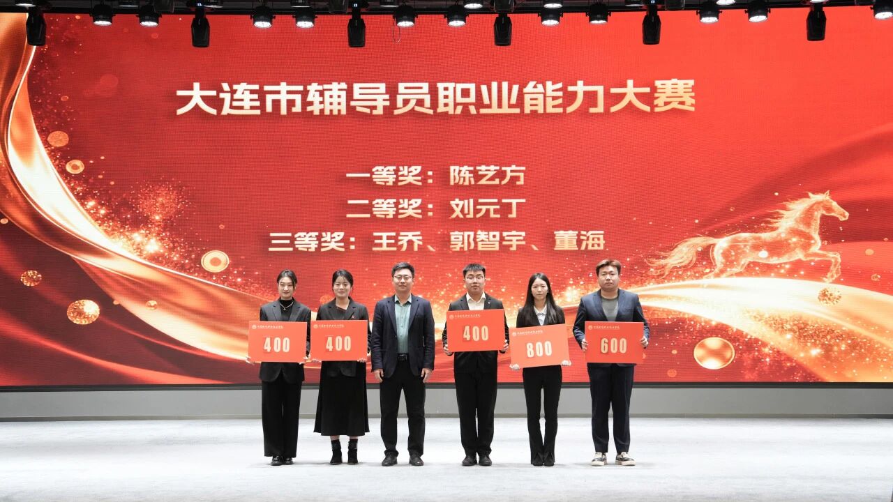 学工部部长王博为大连市辅导员职业能力大赛获奖者颁奖。