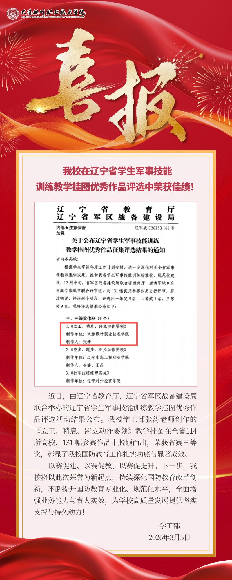 喜报 我校 辽宁省 辽宁 学生 军事 技能 训练 教学 挂图 优秀作品 优秀 作品 品评 评选 选中 荣获 佳绩