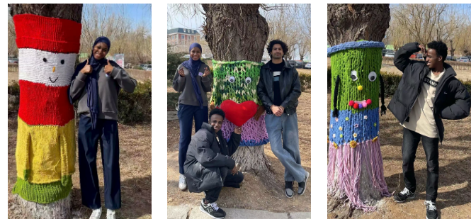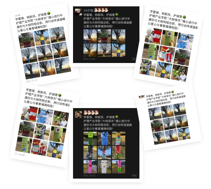 “大树穿衣”现场暖意融融,志愿者们三两一组、默契协作,指尖翻飞间,五彩斑斓的毛线缠绕在挺拔的树干上,原本单调的枝干披上了充满童趣与温情的“暖心花衣”。穿上“彩衣”的树木瞬间鲜活起来,化身校园里的“多巴胺打卡点”,路过的同学们纷纷驻足,与这些“暖心大树”合影留念,随手拍下美好瞬间分享至朋友圈,让志愿暖意通过屏幕传递开来。