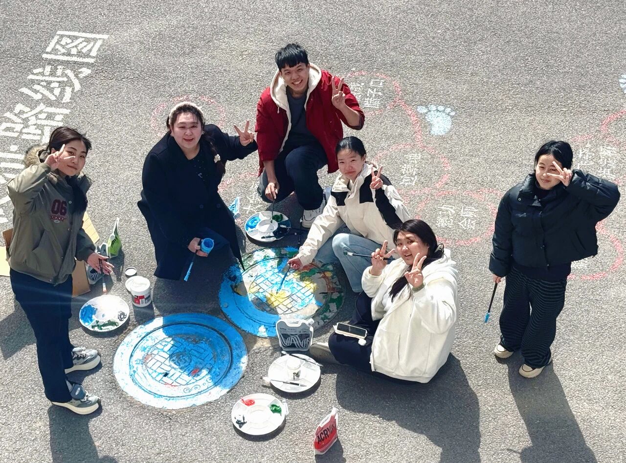 另一边的井盖彩绘现场更是创意迸发,成为校园里最吸睛的“网红打卡地”。志愿者们充分发挥想象力,在一个个不起眼的井盖上俯身执笔、勾勒线条、填充色彩,将春日的生机盎然都绘于方寸之间。经过数小时的精心创作,冰冷的井盖摇身一变,成为一幅幅色彩鲜艳的“地面艺术品”。