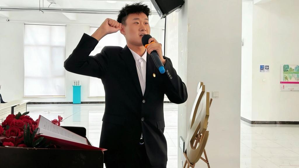 在鲜艳的团旗前,团员代表张宏硕带着全体新团员高举右拳庄严宣誓,铿锵誓言是对团组织的郑重承诺,更是青春的责任与担当。