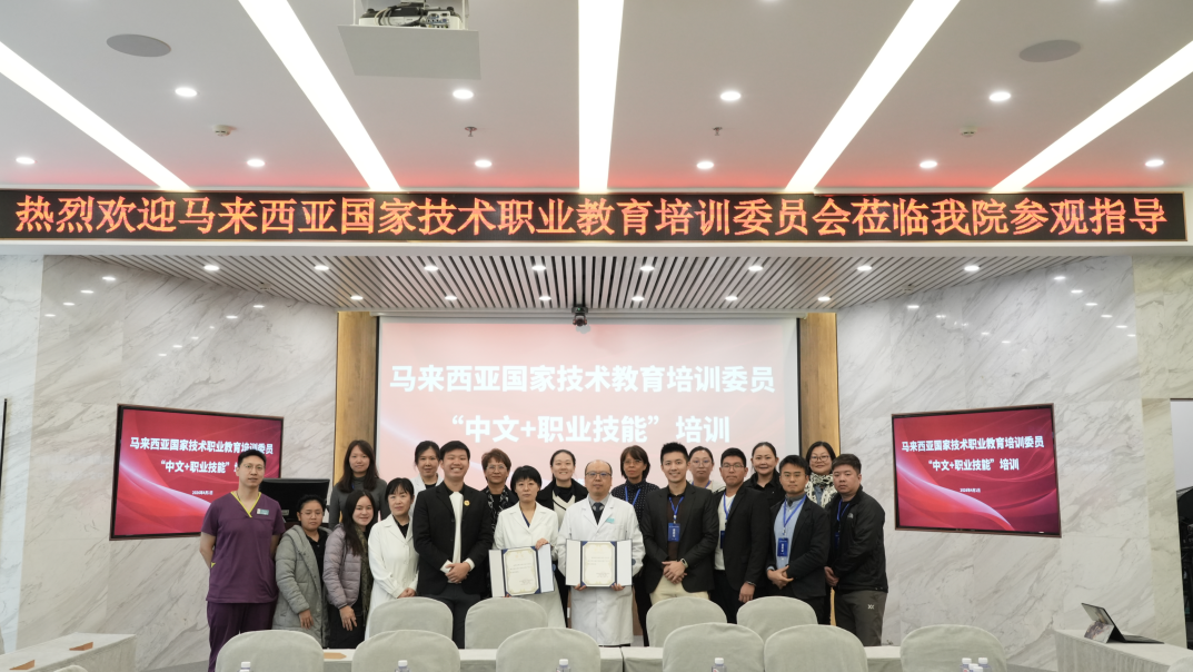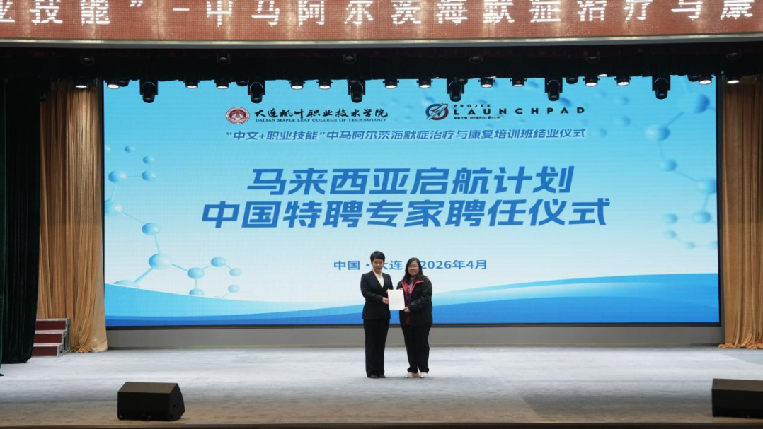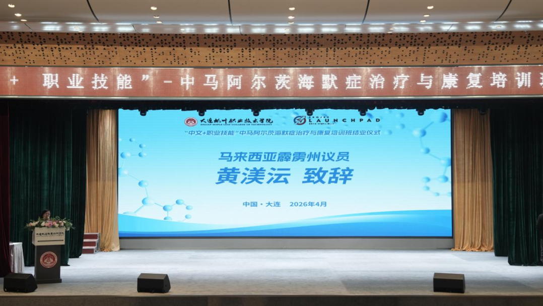 春风送暖,山海相逢。2026年3月26日,马来西亚国家技术职业教育培训委员会代表团一行远道而来,莅临大连枫叶职业技术学院,开展为期12天的“中文+职业技能”阿尔茨海默症治疗与康复专题培训交流。历经系统理论学习、临床机构参访与技能实操实训,本次国际培训交流圆满完成各项议程,在学校七顶山校区报告厅顺利举行结业仪式,一场以中文为桥、以技能为媒、以友谊为纽带的跨国职教交流圆满落幕。