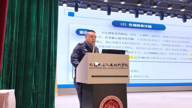 宣讲现场,白春生所长结合真实案例,剖析了色情刷单诈骗套路。不法分子利用不良网站,以返利、福利为诱饵诱导学生下载非官方 APP,骗取信任后实施大额转账诈骗,致使财产损失难以追回。民警提醒同学们远离不良网站,不点陌生链接、不下载未知 APP,拒绝刷单返利诱惑。