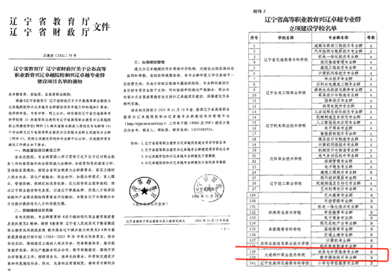 根据《辽宁省教育厅辽宁省财政厅关于开展高等职业教育兴辽卓越院校和兴辽卓越专业群建设项目申报工作的通知》要求,经学校申报、辽宁省教育厅组织专家根据遴选评审、网上公示等程序评选出25所辽宁省高等职业教育兴辽卓越院校和141个辽宁省高等职业教育兴辽卓越专业群。