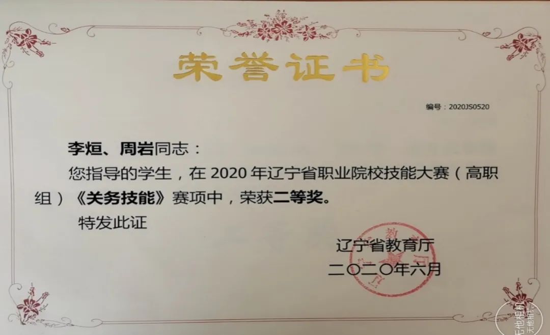 2020年辽宁省职业院校技能大赛(高职组) 关务技能赛项中荣获二等奖