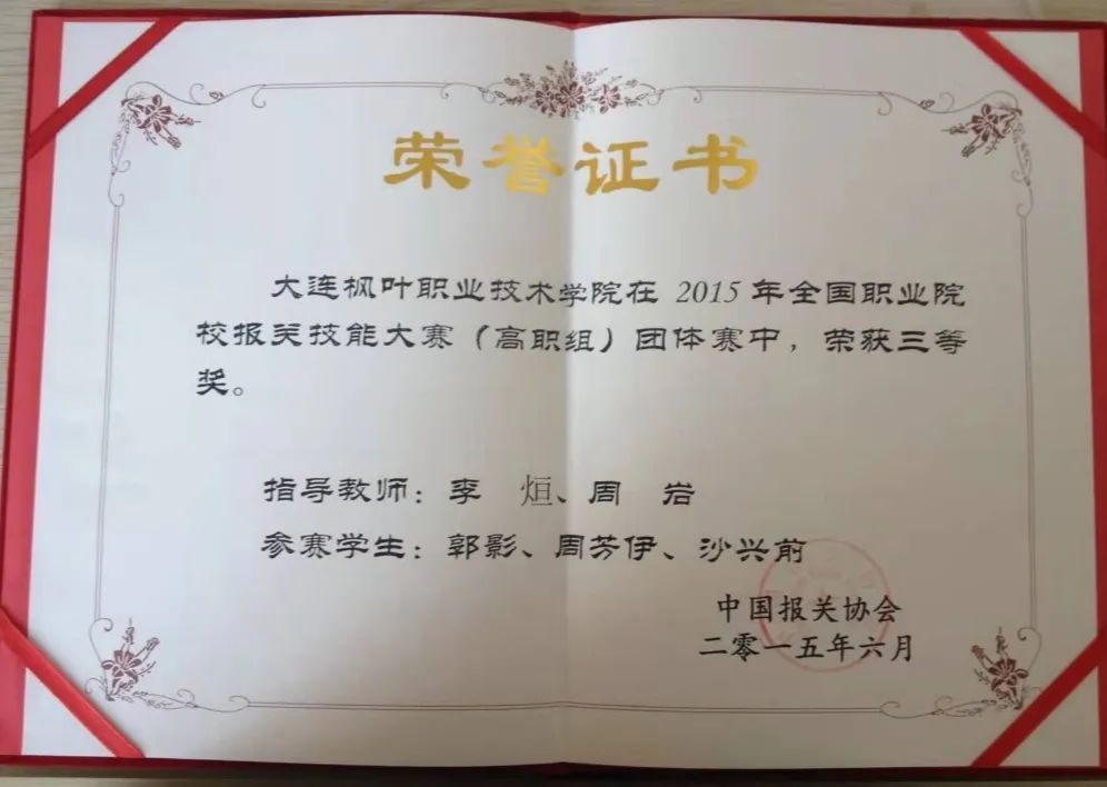 2015年全国职业技术院校报关技能大赛(高职组)团体赛荣获三等奖