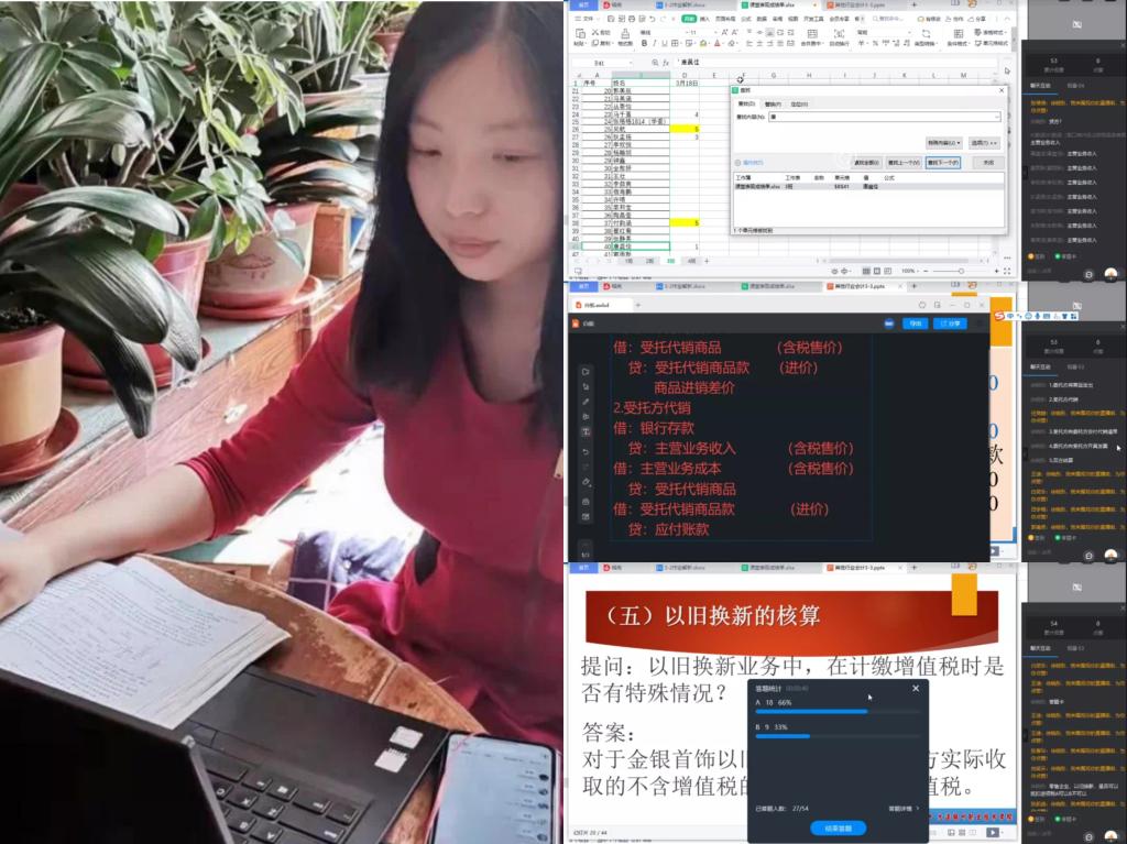教学设计:注重课堂互动与重难点解析。例如在讲解零售企业受托代销业务时,以表格形式将新业务与已学业务的账务处理进行对比,用不同颜色突出显示加以区别,方便学生理解。并不定时在直播中通过公屏和答题卡功能进行提问,实时积分并记录,课后学习通给予对应经验值,以提高学生的学习兴趣与课堂参与度。此外,通过钉钉中的白板功能,实时总结本课重难点,直播结束后发布至群内,方便学生课后复习。最后,通过布置作业,检验学生掌握程度,并于下节课课上进行答疑讲解。