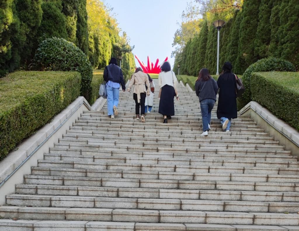 教师们通过层层阶梯,前往“血与火”雕塑广场。这座高17米,使用钢材150吨的雕塑呈现出鲜艳动感的红色,如燎原的烈火,冲天而起,生生不息;又似喷涌的热血,化作碧涛,无怨无悔,象征经过血与火洗礼的人们渴望和平、自由的心情。