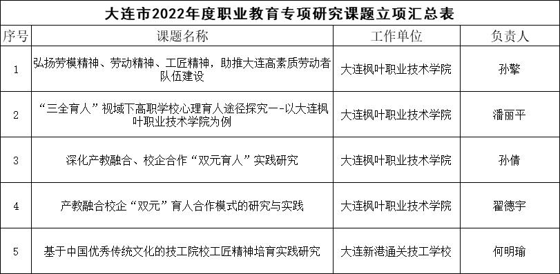 课题之花朵朵开,科研之果乘风来。为贯彻上级文件精神,打造高水平、研究型可持续发展的师资队伍,提升学校教育科研水平,助力教师教育教学能力不断提升,促进教师的专业化成长,我校教师积极申报大连市2022年度职业教育专项研究课题(弘扬新时代劳模精神劳动精神工匠精神教育研究课题),成功立项5项,其中高职4项,中职1项。