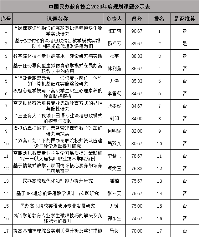 根据《大连枫叶职业技术学院科研项目管理办法》以及《关于申报中国民办教育协会2023年度规划课题的通知》等文件精神,我校积极组织申报工作,经个人申报,高教研究室组织学术委员会3位专家进行匿名评审,现将17项课题得分及排名予以公示(见附件),并拟推荐前3项课题申报中国民办教育协会2023年度规划课题。