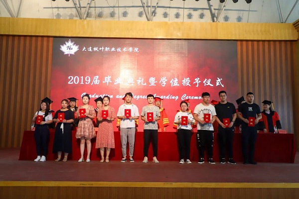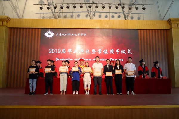 伴随着雄壮的国歌,毕业典礼在综合馆正式开始。一段视频勾起同学们对校园生活的回忆。典礼由团委学生处\保卫处处长高成林主持,学院院长杨捷,书记、副院长申秀梅,副院长解建国,副院长金晓晖,教务处处长张冬冬,财经商贸系主任林晓慧,工程技术系主任王晓琳,现代服务系系主任于庆霞,创业就业办主任张晓洁莅临典礼现场。“三载励志成才,一朝鲲鹏展翅”!院长杨捷的讲话饱含深情,纯真朴实,寄托着对毕业生深深的依恋和美好的祝愿。毕业生代表张政、黄晨同学的朗诵深情地表达了全体毕业生的不舍心声和对母校的无限感激。教师代表李德民的寄语表达了老师们对毕业生的无限祝福。书记、副院长申秀梅宣布了2019届优秀毕业生表彰决定、学位授予决定。全体领导为同学们颁发毕业证书和荣誉证书。最后,院长杨捷授予本科学位证书。