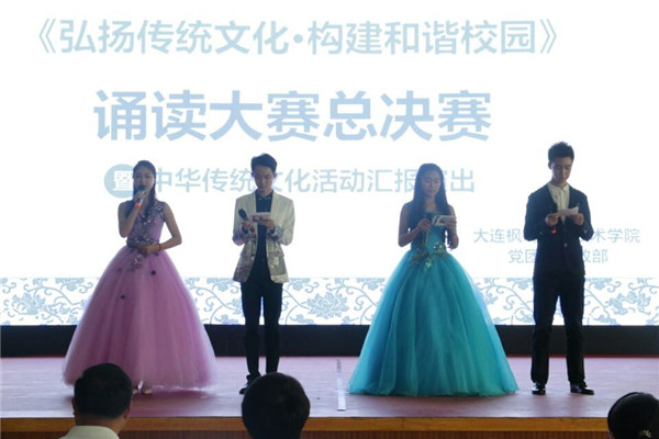 为将中国优秀传统文化融入学生思想教育工作中,丰富德育内涵、增强育人效果,以学院“十三五”发展为契机,培养广大师生积极向上的文化价值观和民族精神,构建我院具有内涵和特色的校园文化,党团学思政部联合开展了《弘扬传统文化·构建和谐校园》系列活动。为了进一步实施我院国学经典诵读工程,营造传统文化学习氛围,深化传统文化在校园文化建设中的积极作用,我院举办了以“礼敬中华经典•诵读国学精粹”为主题的晨读好声音活动。2016年6月7日,《弘扬传统文化•构建和谐校园》诵读大赛总决赛暨中华传统文化活动汇报演出在综合馆隆重举行。参加本次活动的领导有:副院长申秀梅、学生处处长高成林、教务处副处长裴丽琳、船舶与珠宝学院主任王晓琳、通关系主任林晓慧、通关系副主任徐凤龙。本次大赛的评委老师有:教务处副处长张冬冬、学生处处长助理吕运福、基础部主任张淑萍、招生工作处梁陆宇老师、就业指导中心徐素青老师、党办周裕老师、团委书记成名。