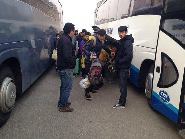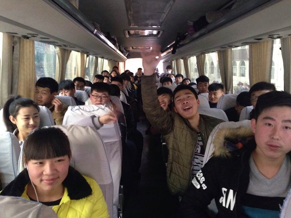 同学们上车摆放好行李等待出发