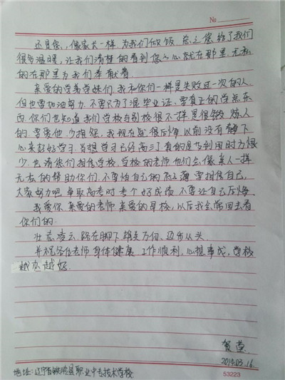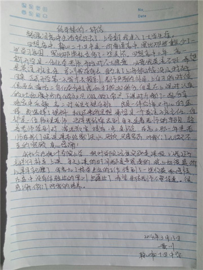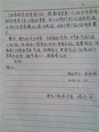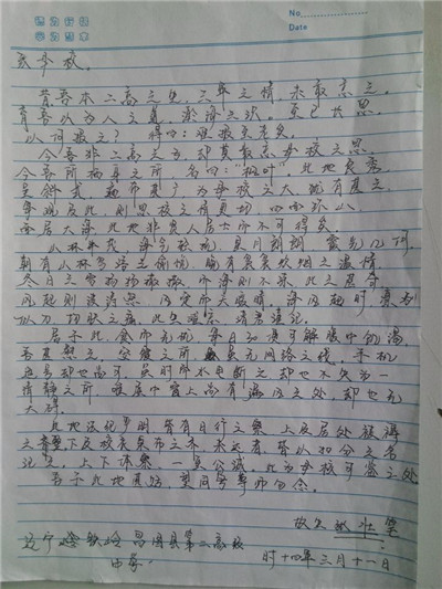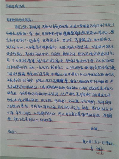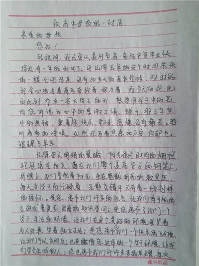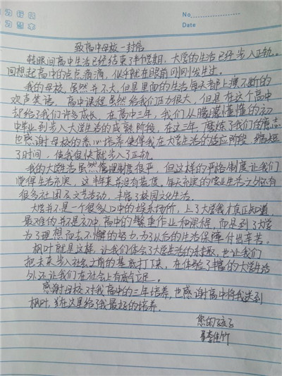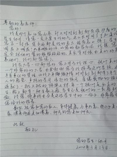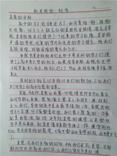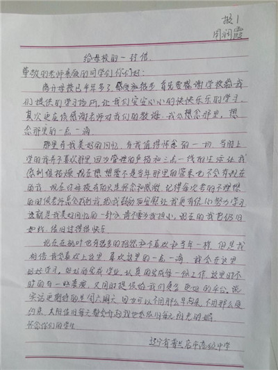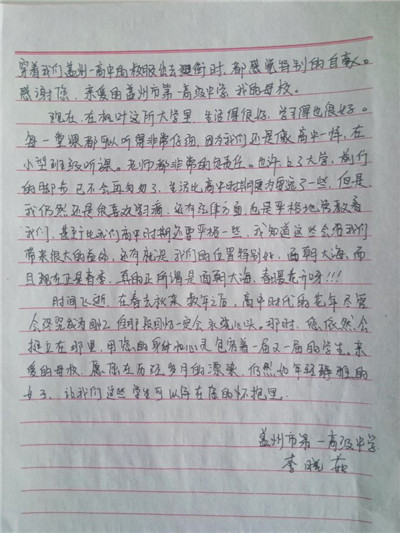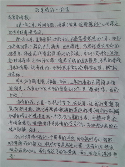 步履匆匆,大学生活已经过去一个学期了,同学们经历了很多,也成长了很多,有收获,更有感悟,从过去的学习中总结经验,坚定自己的目标,才能把握未来的方向,更好更充实地度过三年大学生活。在信中,同学们用回忆抒写了自己的高中时代,回想老师对自己的点滴教育,写下了心中对高中母校的思念与感激,同时也向母校介绍了在大连枫叶的发展和取得的成绩,汇报了自己在大学中的学习和生活情况,参加社会实践和校内活动的收获感悟。