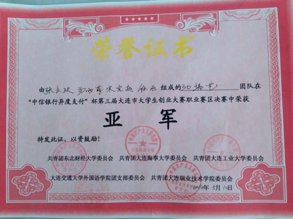 2013年5月12日在大连市职业技术学院举办了“异度支付”杯第三届大连市大学生创业大赛大职院赛区区决赛,决赛包括3个环节,一共有6组成员参赛,我院张庆政、汤宇萌、宋宪超、徐丞同学的3D墙艺团队在此次比赛中取得了第二名的优异成绩,让在场的评委印象深刻,让我院引以为傲。这次比赛让我们深刻的意识到创业对于大学生而言是一次人生的历练,也是一次认识自我的机会,我们人生当中的任何一次经历,任何一次磨难,都只是为了让我们更好的成长,所以我们应积极的抓住属于我们的机会,等待着属于自己的一屡阳光。