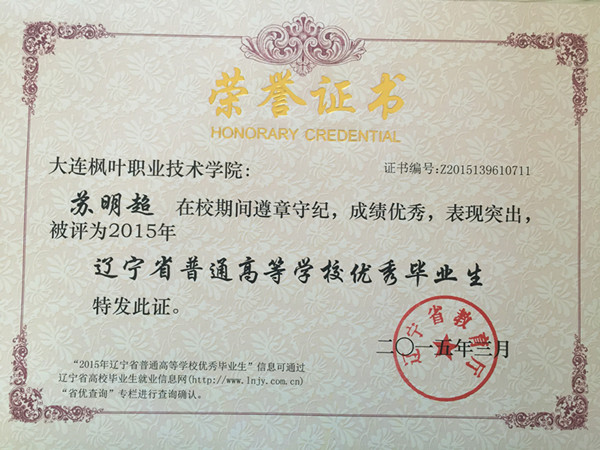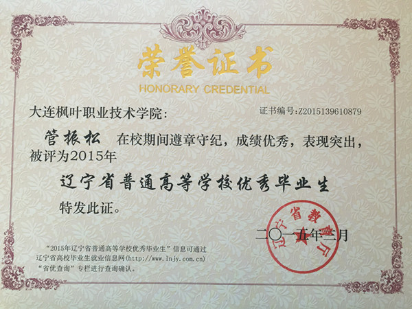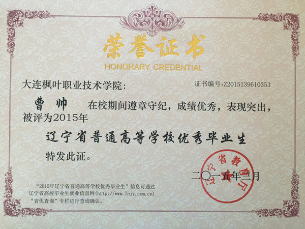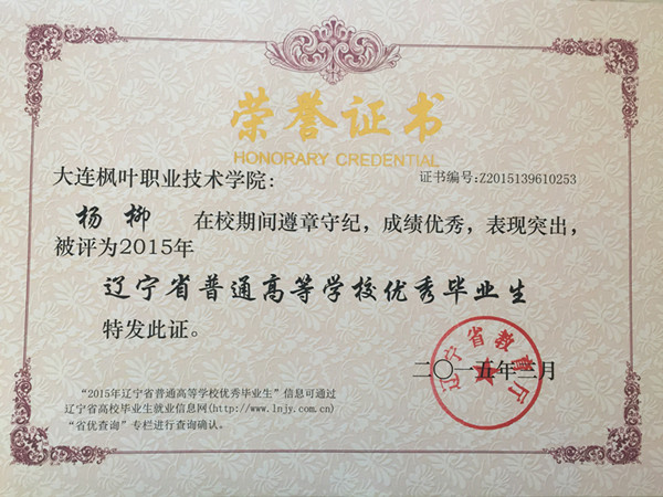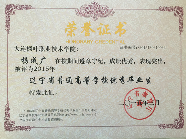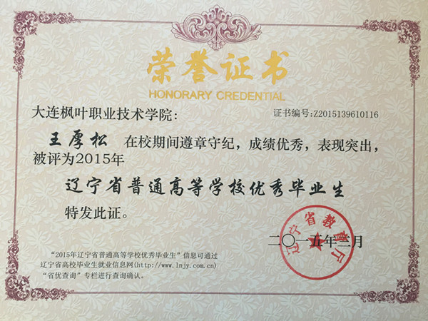 2015年我院毕业生共计1335人,本届毕业生在校期间,积极投身校风学风建设,勤奋学习,勇于实践,为学院发展和建设做出了积极贡献,涌现出了一批德、智、体、美等各方面全面发展的优秀毕业生。根据 《教育部关于做好2015年全国普通高等学校毕业生就业创业工作的通知》(教学[2014]15号),学院本着公开、公平、公正的原则,经过本人申请、材料报送、学院审核、上级批准等程序,评选出报关与国际货运专业王玉环、韩蕊、姜忠琛、管振松、苏明超、曹帅、尹明利、李萌、高海江、赵洋,图形图像制作专业杨柳,船舶工程技术专业黄飞、杨成广、王厚松,动漫设计与制作专业宋宪超,国际邮轮乘务专业包云鹤,宝玉石鉴定与加工技术专业王明,应用英语专业王佳月18名辽宁省普通高等学校优秀毕业生。希望受表彰的同学谦虚谨慎、戒骄戒躁、再接再厉,在迈入社会、走上工作岗位之后,能运用所学的知识和掌握的技能不断开拓创新,积极进取,在工作岗位上再创佳绩,为母校争光,为祖国的建设奉献自己的青春和才智。