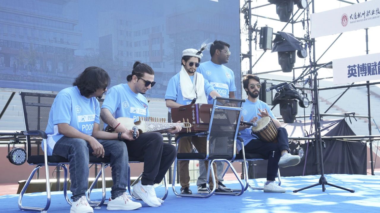 上午8点,开幕式在激昂的旋律中拉开帷幕。首先举行升国旗仪式,伴随着庄严的国歌声,五星红旗冉冉升起,现场气氛庄重而肃穆。随后,大连新港通关技工学校同学们带来了啦啦操表演《青春无限》,轻盈的舞姿与动感的节奏瞬间点燃全场热情,国际友人的吉他弹唱节目更是让现场掌声雷动。
