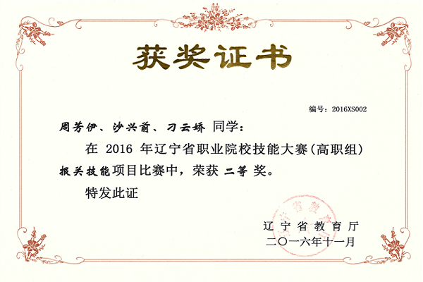 2016年4月辽宁省职业技能大赛报关赛项,荣获二等奖