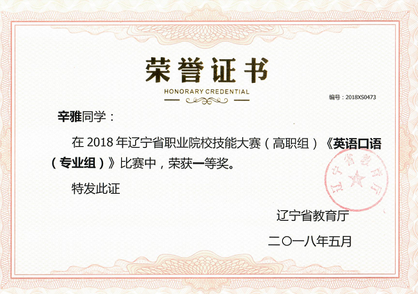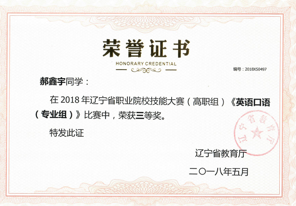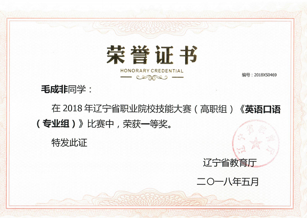 2018年辽宁省职业院校技能大赛英语口语(专业组),财经商贸系16英语(国贸)1班毛成非在王晓光的指导下,荣获个人赛一等奖,现代服务系16酒店2班辛雅在闫博的指导下,荣获个人赛一等奖;财经商贸系17英语(国贸)1班郝鑫宇在陶毅的指导下,荣获个人赛三等奖。