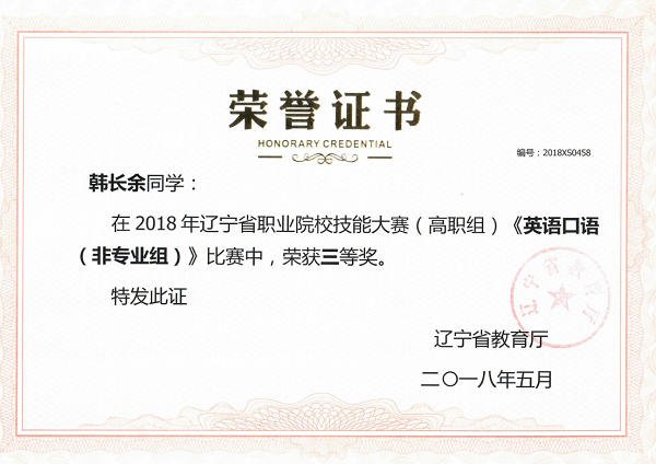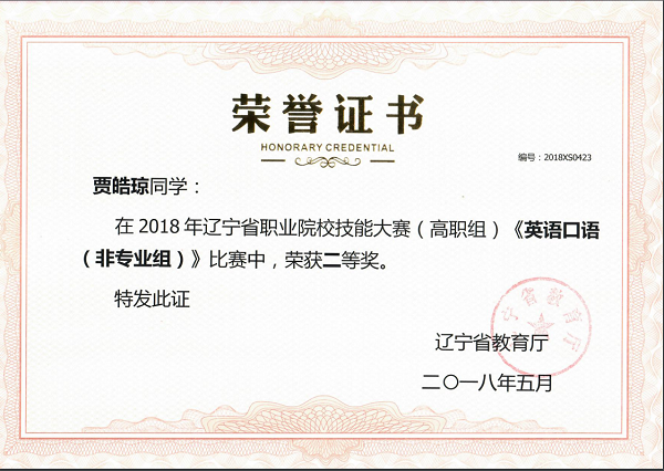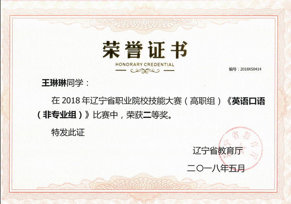 2018年辽宁省职业院校技能大赛英语口语(非专业组),我院财经商贸系16报货4班贾皓琼在高飞的指导下,荣获个人赛二等奖;现代服务系16邮轮1班王琳琳在闫博的指导下,荣获个人赛二等奖;16邮轮2班韩长余在闫博的指导下,荣获个人赛三等奖。