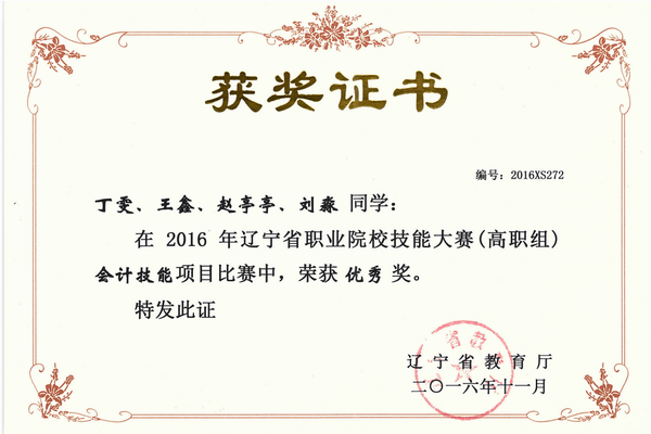 2016年4月辽宁省职业技能“会计综合技能赛项”荣获优秀奖