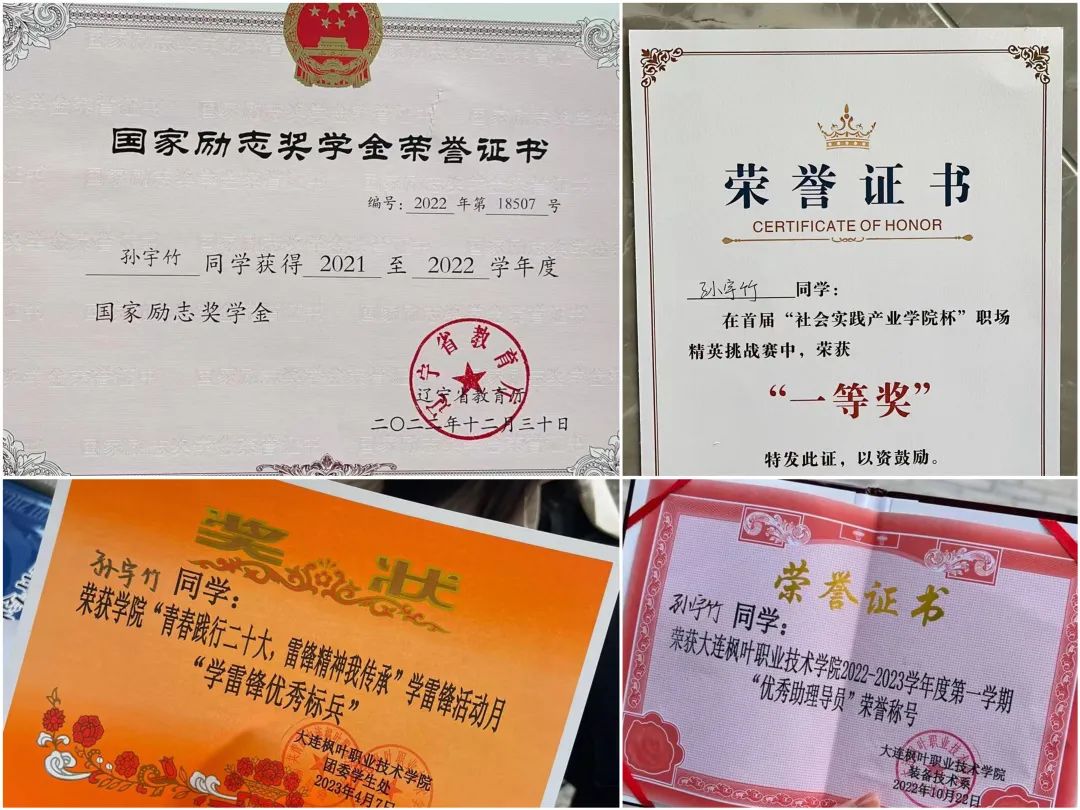 孙宇竹,女,大连枫叶职业技术学院装备技术系2021级宝玉石鉴定与加工专业1班 班长,曾获:国家励志奖学金、学院职场精英挑战赛 一等奖;担任22级综合1班助理辅导员、学生会学习部部长职务;荣获校级三好学生、学习标兵、优秀班干部、优秀学雷锋标兵、优秀助理辅导员、内务队列标兵等荣誉称号。