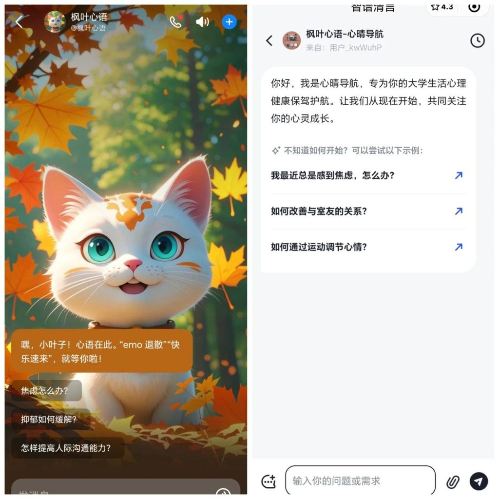 心理教研组创建了2个AI智能体枫叶心语(智谱清言和豆包),即时响应学生的疑问,提高了课堂互动频率和深度。同时,利用AI的情感分析技术,捕捉学生的语音、文字和面部表情变化,评估其情绪状态,并提供个性化的反馈和建议。这种智能互动与反馈系统不仅增强了师生之间的互动,还帮助学生更好地认识自己,提升自我认知。