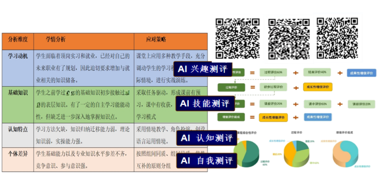 多维度分析学情,借助于AI进行个体化测评,改变以往的单一化评价模式及传统应对策略,形成AI+的多元评价模式,关注学生的个体差异,开展AI+增值评价,构建师生共同体,AI强化下,以智求真,实现本课程的立体化综合性评价体系。