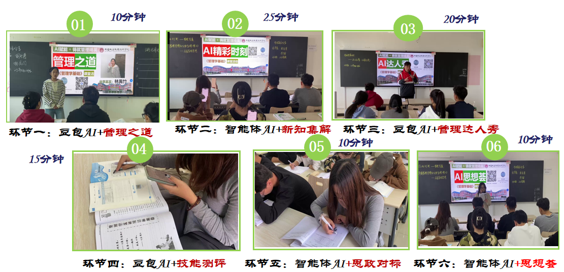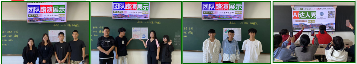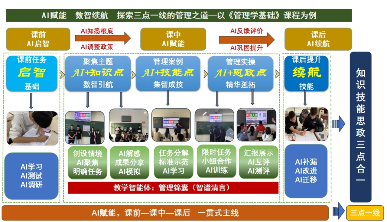 管理学基础课程融入AI设计,“全过程、全领域、全方位”的智体构建,让学生“以AI为器”,提高课堂效率。师生共建、共享、共助,形成了新式的同哺共育课堂新革命。