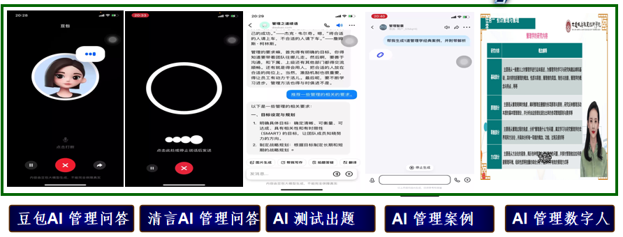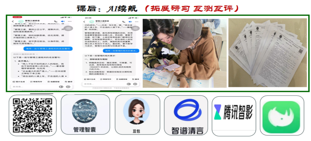 AI的应用,从课前—课中—课后全方位入手,智谱清言、豆包、腾讯影音等AI工具应用,实现学生与专业知识认知交互,与专业技能反馈交互,多渠共建的手段设计,让《管理学基础》的教学“集点成面”,效果显著。