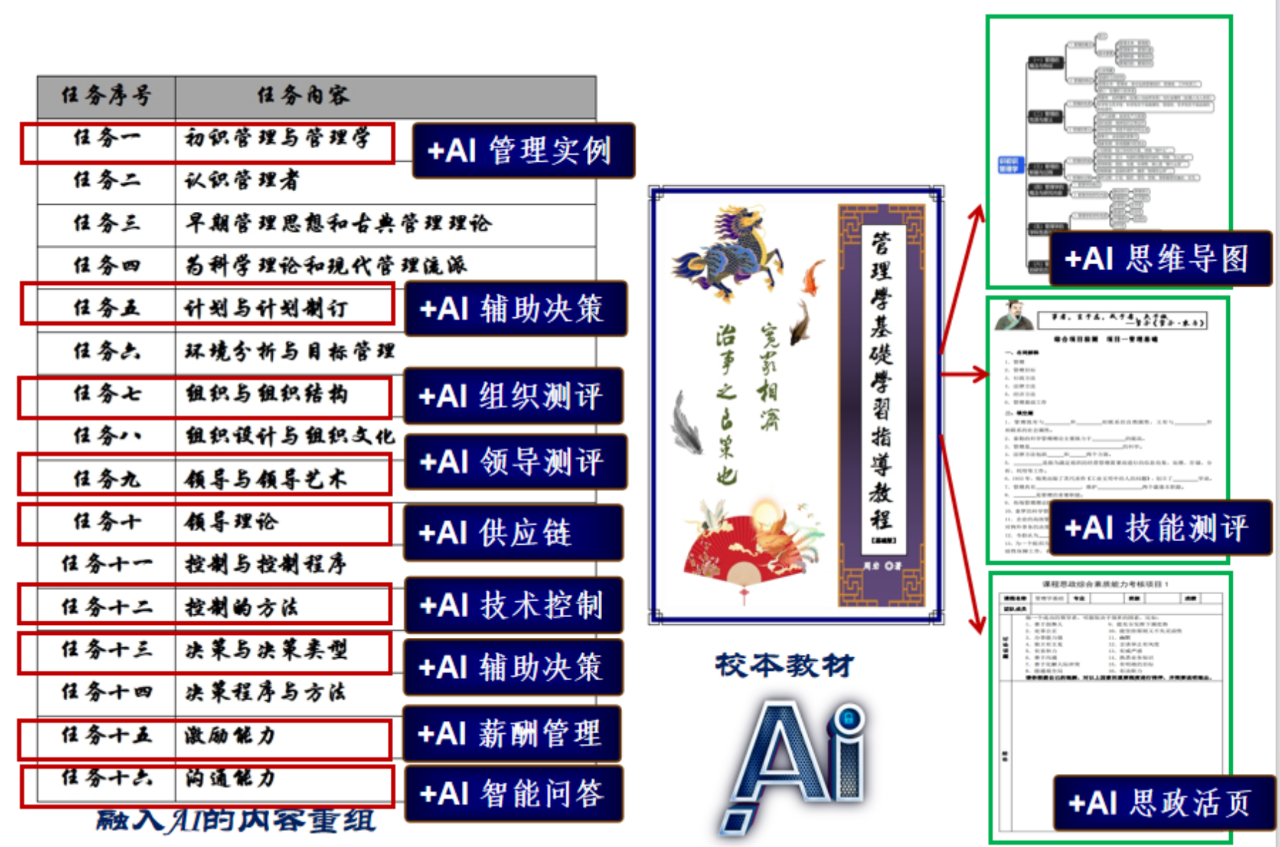在管理学原有授课内容的基础上,深度挖掘AI技能点,巧妙融入最新的AI理念,借助AI完成测评、思政活页等相关内容。