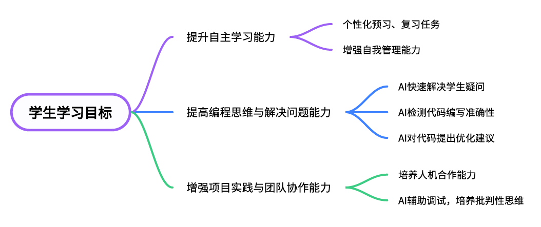 2.学生端:构建学生自主学习、编程思维和项目实践的能力体系。借助AI工具完成个性化学习任务,培养学生人机协作能力和批判性思维。