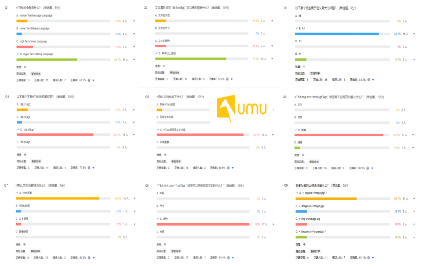 通过UMU互动学习平台导出EXCEL数据,分析学生学习情况,发现问题与薄弱环节。以学生在实际操作中的表现和知识点的掌握情况等不同视角进行评测, 关注学生的实际参与、实时反馈以及个性化的成长轨迹。根据数据调整教学节奏和内容,实现教学方案的迭代优化。