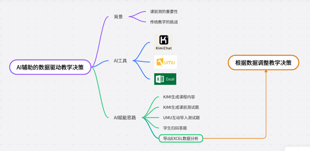 1.课前:课前AI智能生成测试题、预习材料等教学资源。例如:将上堂课重要内容投喂给AI,利用KIMI将投喂的内容智能生成“课前测试题”,再将生成的试题导入UMU互动学习平台,课前对学生进行测试,通过测试了解学生上堂课学习效果。
