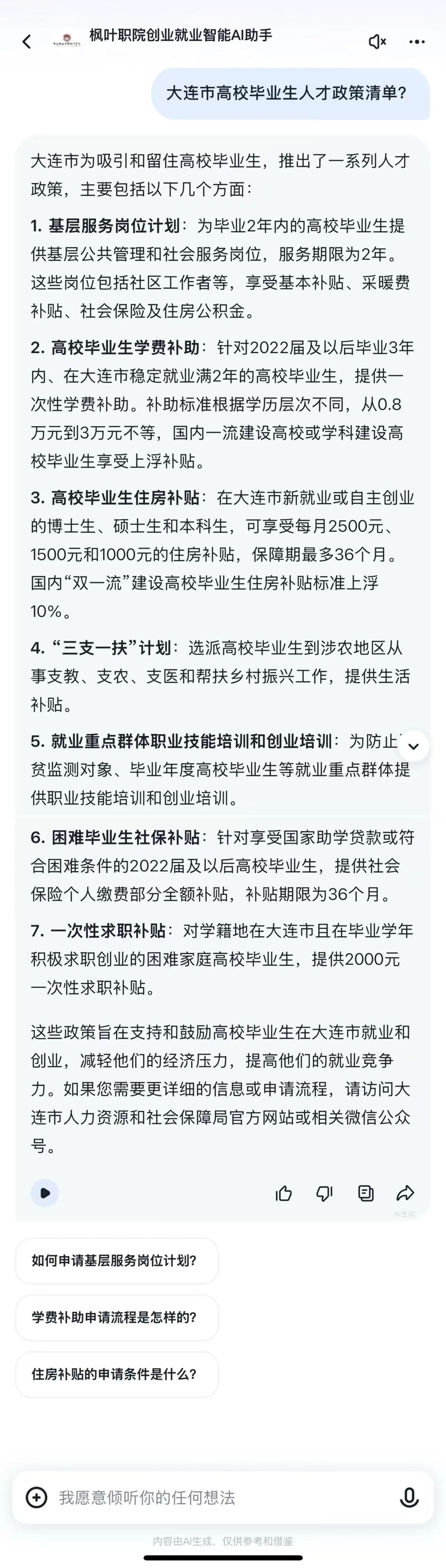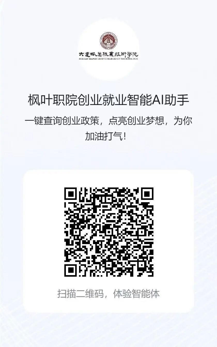 怀揣创业梦想,却被政策难题绊住脚步?别担心!大连枫叶职业技术学院创业就业智能AI助手来啦。一键查询创业政策,轻松掌握补贴、贷款等关键信息。扫描下方二维码,开启智能体验,为你的创业之路加油打气,助你迈出成功第一步!