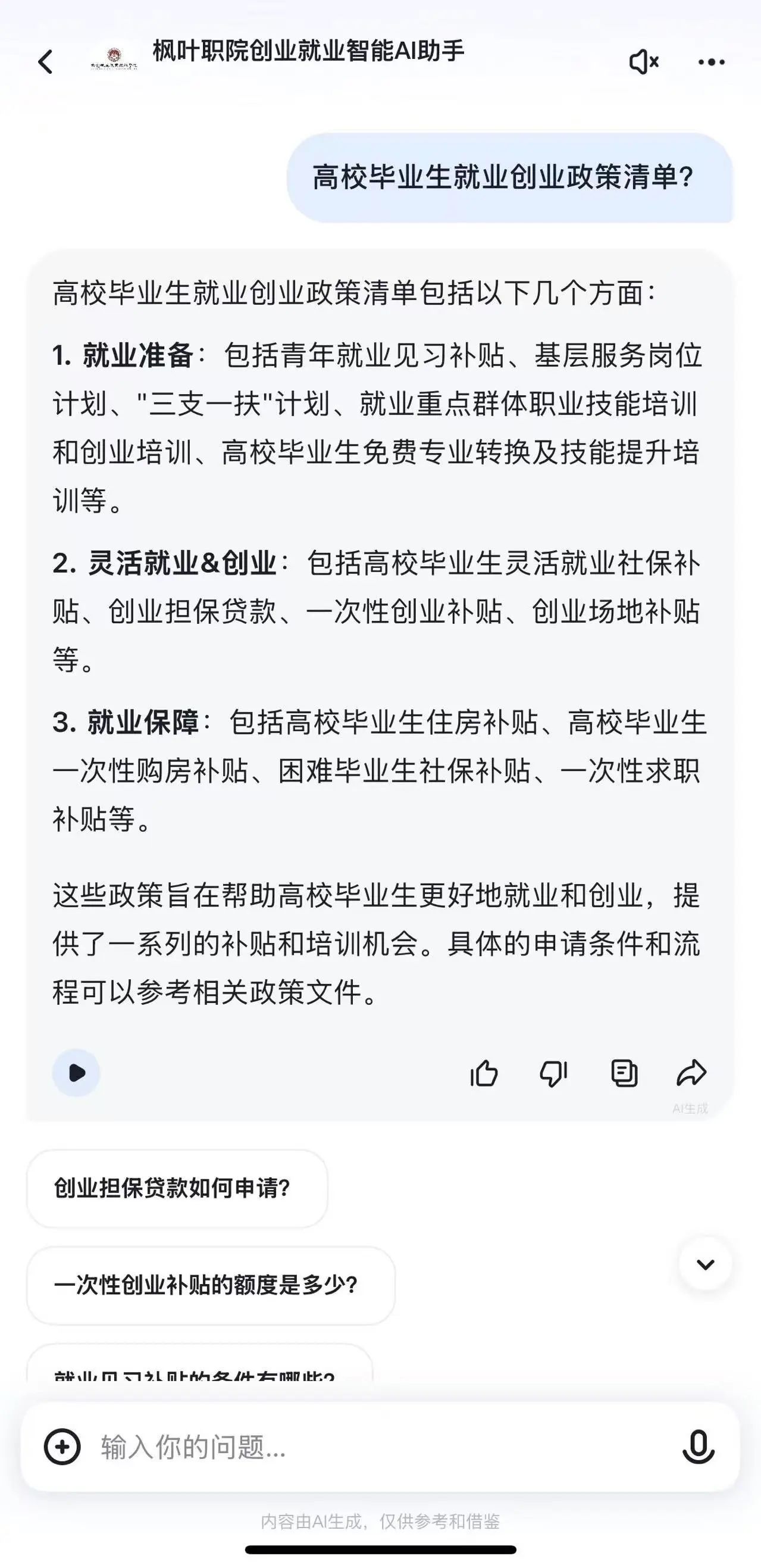 (1)24小时答疑:无论是就业问题还是创业问题,AI智能体都能为你提供全天候的解答。