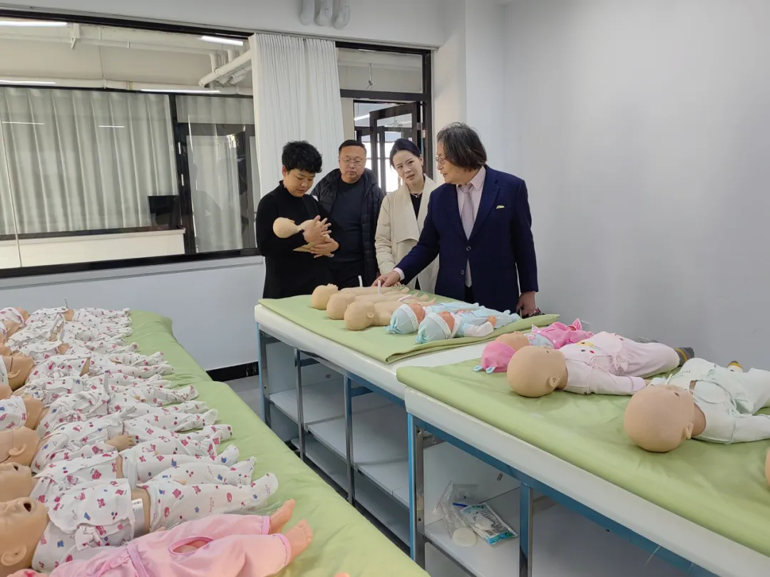 王忠泽院长与王珊院长首先陪同吉井胜行先生参观了我院大黑石校区护理产业学院实训室。王珊院长详细介绍了各专业实训室的设备配置及投入使用情况。护理产业学院教学楼作为集护理教学与临床一体化的实训培训基地,曾在2024年辽宁省第二届职业技能大赛中,为“养老护理员、健康照护、健康和社会照护、母婴护理员”等项目提供了有力的实施保障。日方对我院在护理技能培养方面的大力投入与支持给予了高度肯定。